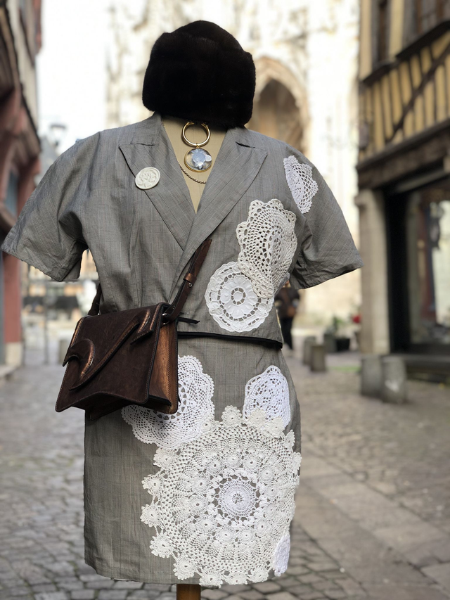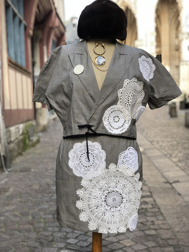 Haut : Blazer manches courtes motif Prince de Galles, ancien ensemble vintage Darel, j'ai retravaillé la coupe, raccourci, retiré des pinces, les boutons, fabriqué un nouveau système de fermeture, mis un biais en bas pour plus de modernité et enfin je suis venue coudre de magnifiques napperons en dentelle fabriqués à la main par nos aïeules.