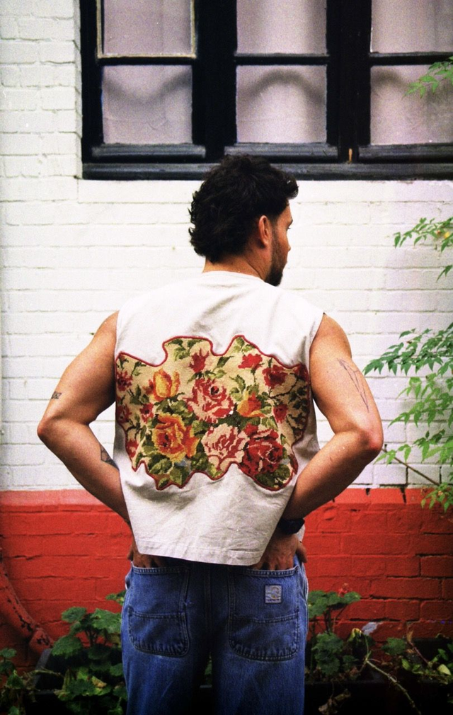 Caneva floral en coton au dos et broderies rouges sur le devant