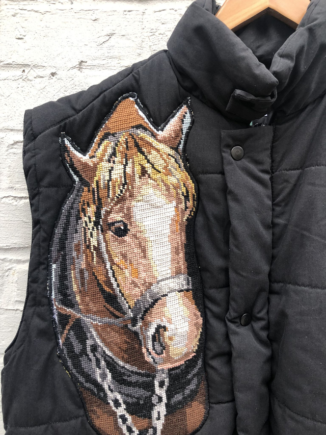 Doudoune sans manche remise au gout du jour avec empiècements en caneva en coton.